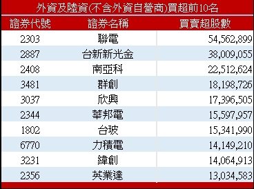 统计外资买卖超个股前十名发现,外资买超联电54,563张最多,其次是买超台新新光金(2887),另外,南亚科、华邦电、力积电也同获外资买超;外资卖超友达19,938张最多,其次则是卖超宏碁(2353)18,417张。