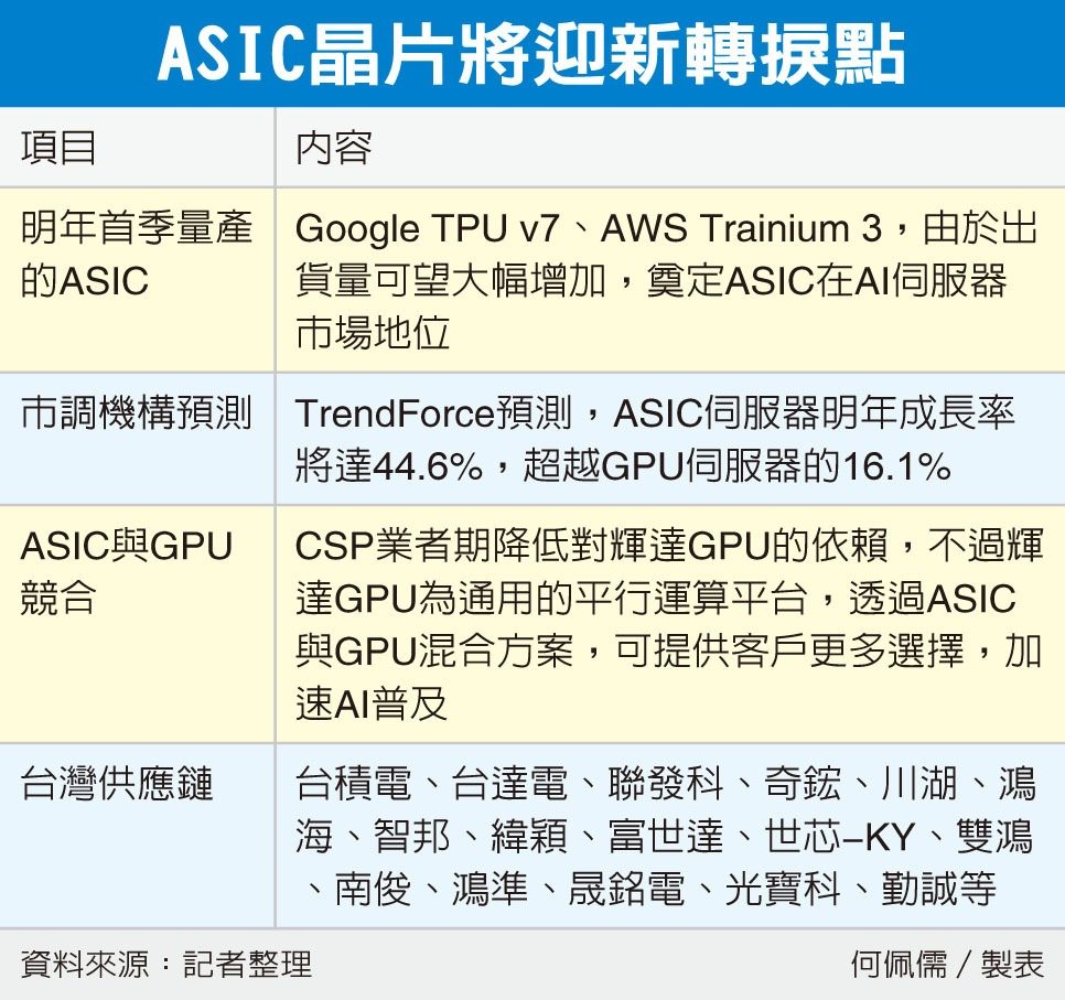 AI持续为2026年资本市场焦点已无悬念,但辉达(NVIDIA)GPU不再独享聚光灯,特殊应用晶片(ASIC)也将打光。法人表示,Google TPU v7、AWS Trainium 3明年首季有望进入量产,将为ASIC带来新契机,台湾供应链包括台积电(2330)、鸿海、广达、台达电等将通吃GPU与ASIC市场。
