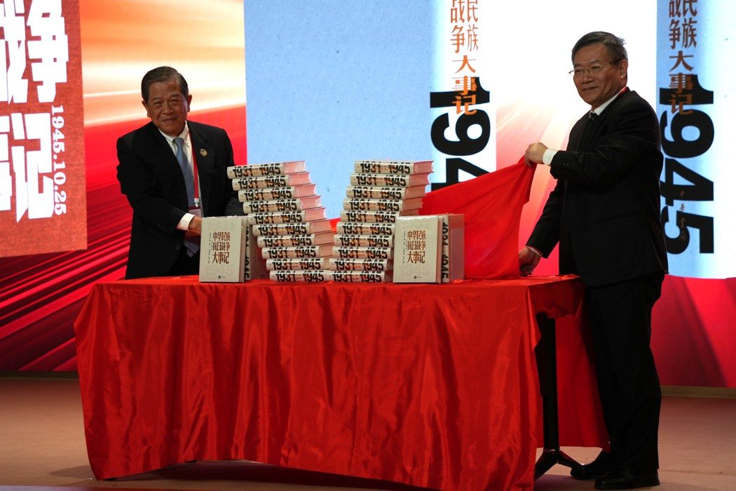 开幕式后,作为台湾光复纪念协会监事长的退役中将黄炳麟在《中华民族抗日战争大事纪》新书发布会上发言,和陆方代表共同揭开新书。