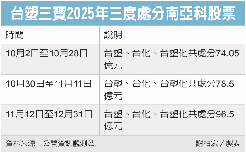 台塑集团处分南亚科股票,去年获利吞补丸。台塑(1301)、台化及台塑化昨(31)日公告,自2025年11月12日至12月31日期间分别处分南亚科普通股各1,897.2万股,总计处分金额逾96亿元;累计去年三度处分金额近250亿元。
