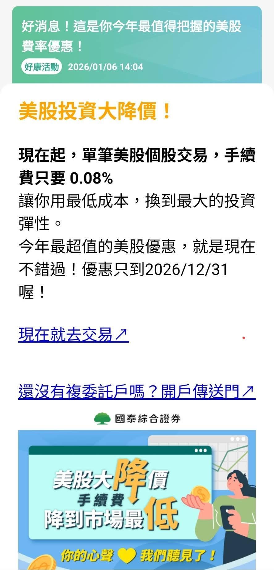 2026年才开始,金融市场就带来一波波投资人好消息。国泰证券自1月6日起,全面调降美股交易手续费,挑战市场最低。这次优惠活动从即日起到2026年12月31日,涵盖个股、ETF和定期定额投资,不管是短线操作、长期布局,甚至是小资族或大户,都能享受超低费率:个股交易手续费只要0.08%,没有低消限制,ETF每笔均一价3美元,费用透明,全球资产配置更简单,定期定额最低10美元就能启动,每笔手续费仅0.1美元,小额投资也能灵活规划。