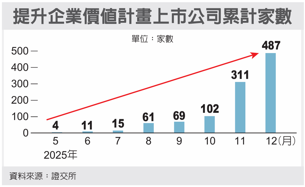 台湾证券交易所推动「Power UpTW提升企业价值计划」,截至去年12月31日,有487家上市公司响应并公告相关计划,占上市公司总家数45.81%。