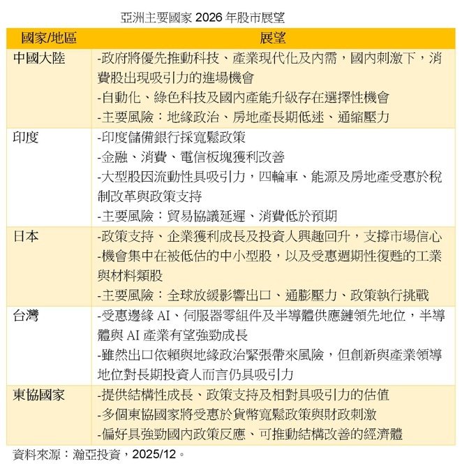 瀚亚投资投资长Vis Nayar表示,股市在2025年波动持续,但仍创下新高,展望2026年,预期中国大陆、印度及日本等亚洲主要经济体将受惠于政策驱动机会,东协国家的成长,将由政策推动,北亚则可望受惠于全球AI基础建设扩张带动。亚洲内部的成长分化,加上市场集中度提升,更凸显出谨慎、主动管理操作以创造超额报酬的重要性。