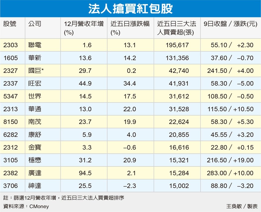 筛选去年12月营收年增的上市柜公司,以近五日三大法人买超张数排序,依序为联电、华新、国巨*、旺宏、世界、华通、南茂、康舒、金宝、稳懋、广达、神达等,几乎清一色是电子股,包括半导体(代工、封测、IC制造、IC设计)、电子零组件、电脑及周边设备等。传产股则是电线电缆股华新。