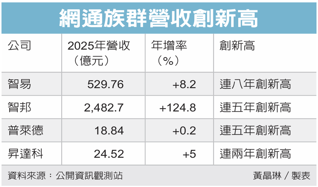 网通族群2025年营运表现亮眼,智邦(2345)、智易、普莱德、升达科、振曜、荣昌2025年营收创新高,法人表示,2026年网通族群,可望搭上宽频基础建设、WiFi 7、AIDC需求等各种题材,推升营运再攀高峰。