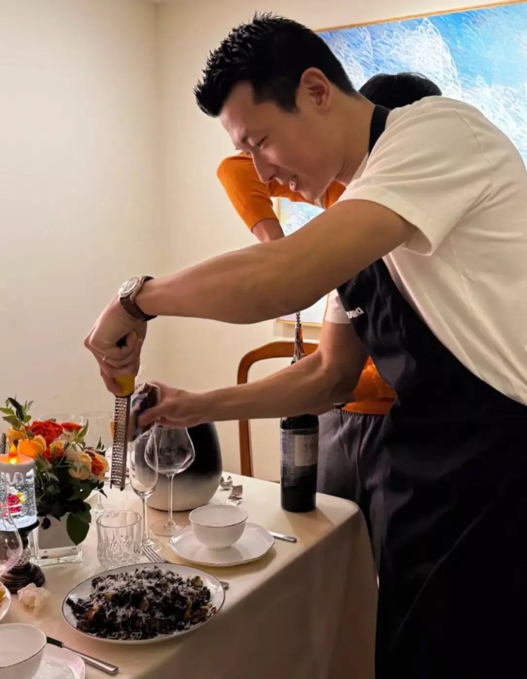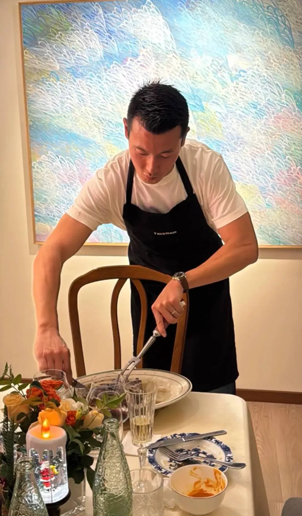 几乎每次朋友来家里聚餐,都是王昀佳掌勺。他们的家里很暖和,应该是开了地暖。王昀佳只穿了一件白色短袖,戴着围裙忙前忙后的模样太有魅力了。