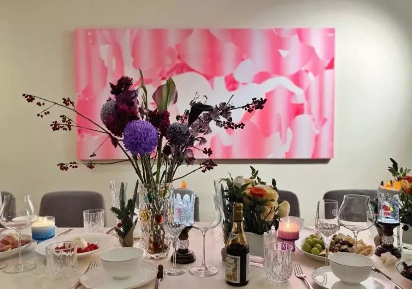 装修很简洁却又格调,和以前老房子的风格差不多,家里主要是靠艺术画来装饰的。在餐厅的大白墙上,挂着几幅艺术画,这哪里像是来聚餐的体验,分明是来看展的节奏!