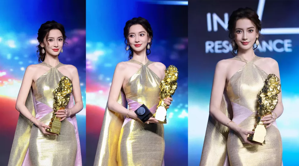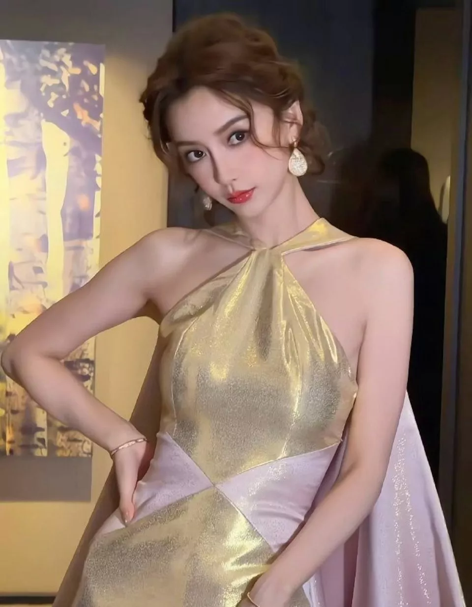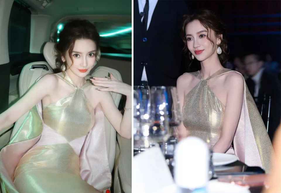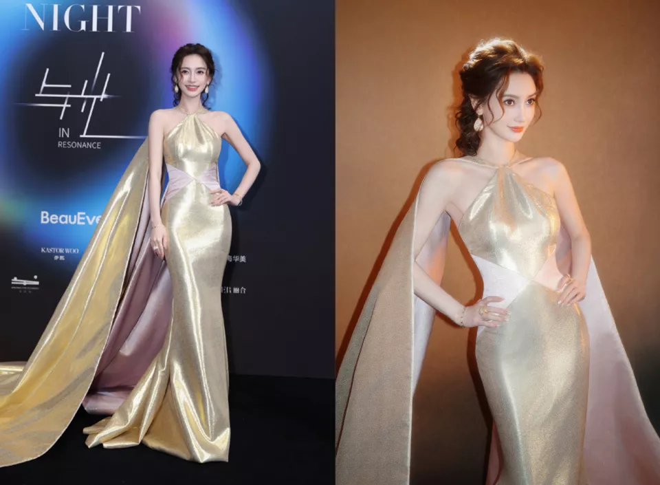 Angelababy一袭秋冬高定鎏金长裙,搭配拖尾披风与微卷麻花辫,整体呈现「公主回归」般的雍容气场,疑似为回归时尚圈造势。