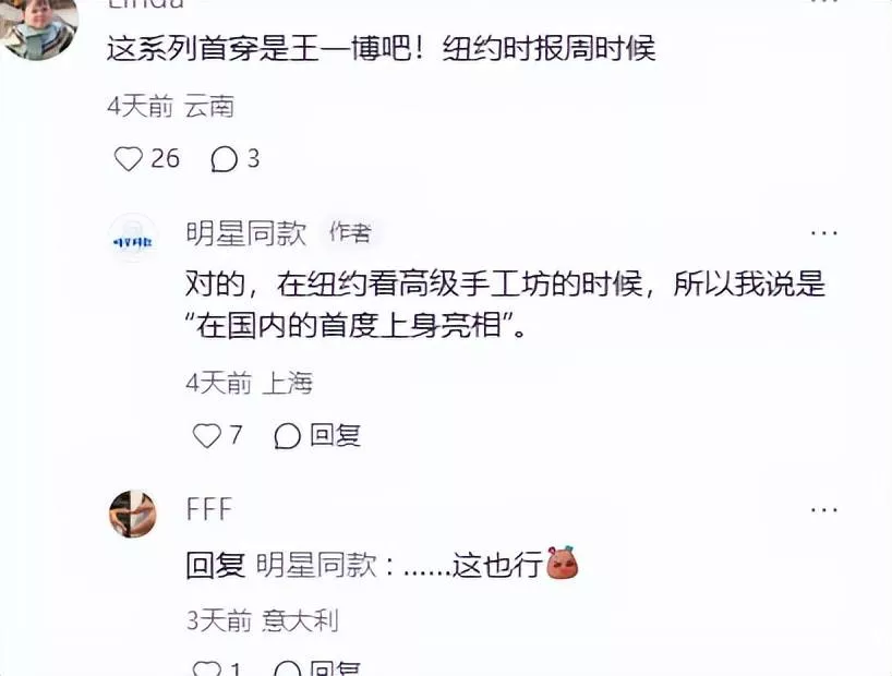 她身上的着装还打着某品牌系列在国内首穿的旗号,不过被网友扒出,这旗号的限定词“国内”有点水。