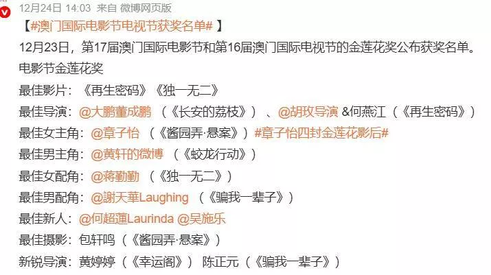 出席金莲花的嘉宾也星光暗淡,整个嘉宾阵容就章子怡一位真正意义上的大咖,请不动其他影后去热场了。