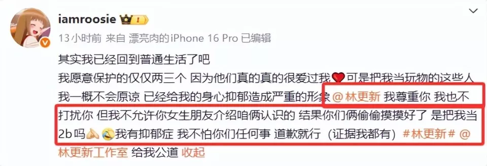1月2日深夜,这位姑娘开始在网上爆料,先点名了林更新,说对方给自己造成了严重的心理伤害,称对方跟介绍她们认识的女生好了,自己被林更新当成了2B,直接@对方让其道歉。