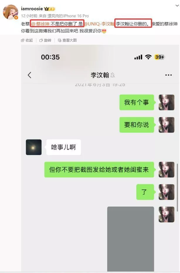 范丞丞一方的回应算是最硬气、最直接的。可爆料仍在继续,女方继续喊话了蔡徐坤,称自己删掉他不是自愿行为,而是李汶翰让她删掉的。