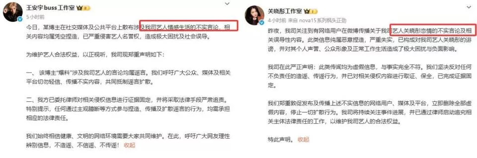 惹得关晓彤和王安宇工作室也紧急下场,各自否认旗下艺人并无恋情,算是也否认了子虚乌有的曝料。