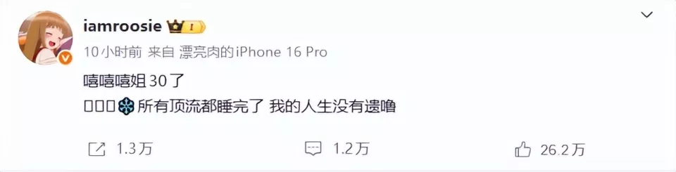 到此,似乎这个iamroosie点名的所有人,以及涉及到的所有事都是捏造并无事实,可她在微博上的那句留言“所有顶流都睡完了,人生没有遗憾”,震撼还是巨大的。