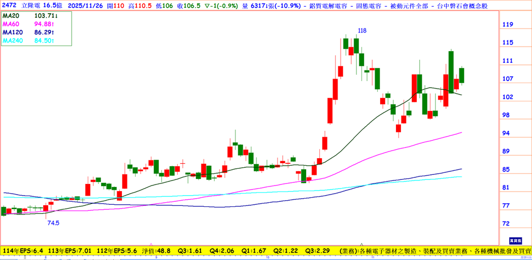 近来又传出立隆已经打入辉达供应链的AI伺服器,兼以超级电容虽未正式打入辉达供应链,但将来有希望也打入超级电容供应链,如此业绩更如虎添翼,今年EPS 6.6、明年EPS可达约8元,以11/25收107.5元、本益比只有16.3倍,建议逢低布局。