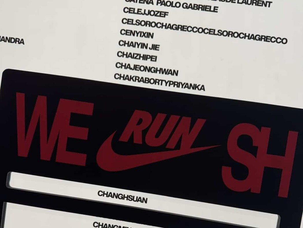 2025上海马拉松在选手领取物资的现场设置了一面名牌墙,墙上列有所有参赛选手的名...