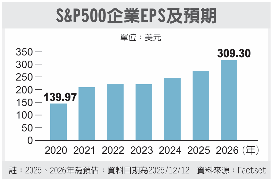 富邦标普500 ETF经理人谢恩雅指出,基本面是支撑2026年美股类股轮动的关键因素。根据FactSet资料,预估2026年S&P 500企业全年EPS为309.3美元,优于2025年的270.86美元,显示美国企业营运体质稳健、获利成长具延续性,美股长线投资价值依旧明确。