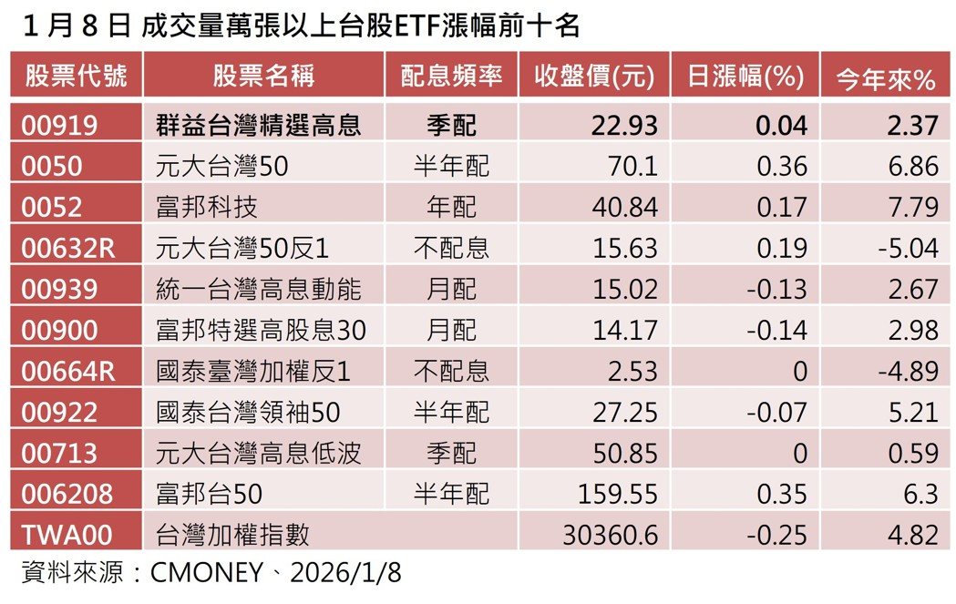 台股創高後連續2天拉回整理,8日小跌74.92點,終場收30,360.55點。不過觀察80檔台股ETF表現,其中群益台灣精選高息ETF(00919)成交量11.69萬張居冠,收盤逆勢上漲0.04%,成為名符其實價量齊揚人氣王。從8日大盤下跌的成交量逾萬張的台股ETF來看,僅00919、0050、006208、00632R、00520共5檔收紅,進一步觀察包括00919在內共有4檔高息型上榜,顯示在大盤高檔震蕩之際,投資人屬性有偏向穩健高息的態勢。