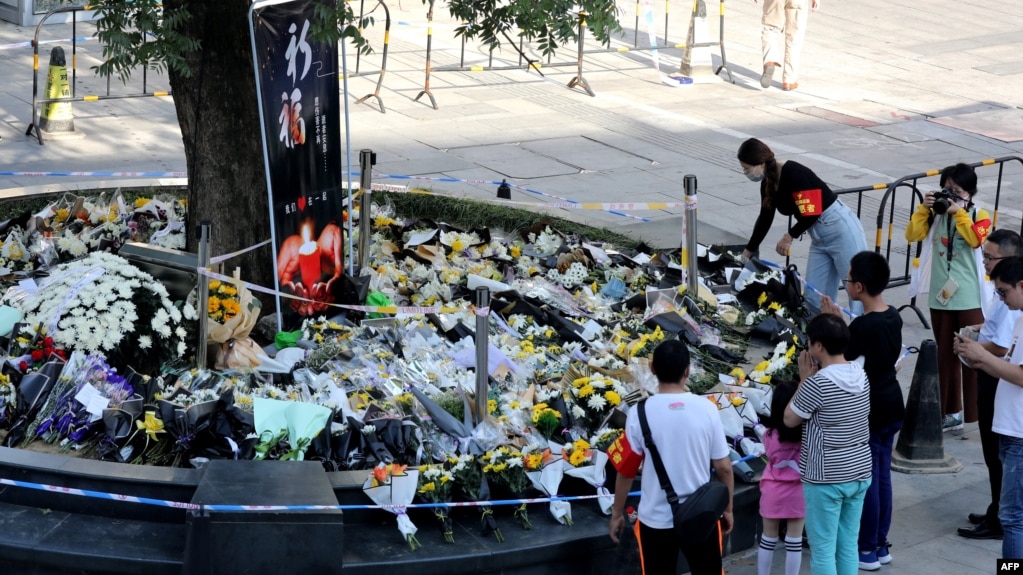安徽安庆市迎江区一名男子持刀在商业步行街上砍杀路人,造成6人死亡、14人受伤,市民案发地点献花悼念遇难者。(2021年6月6日)