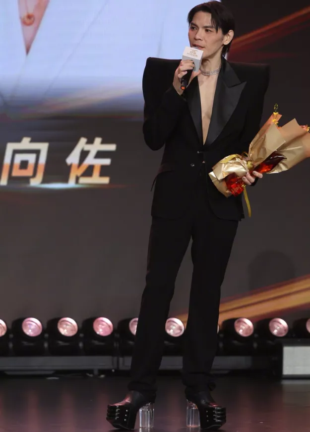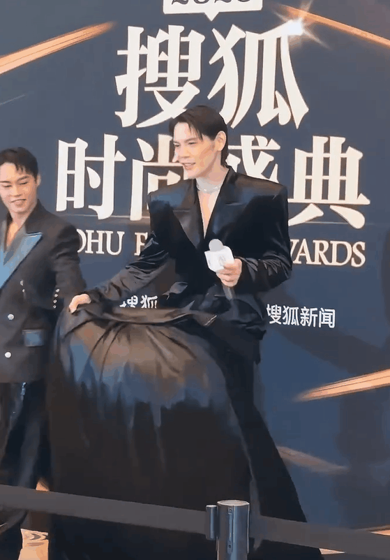 为了有话题度,他这次又弄了奇葩造型,刚登场时下半身就像是套了一个垃圾袋,将装饰拿走后才露出里面的裤子和防水台高跟鞋。
